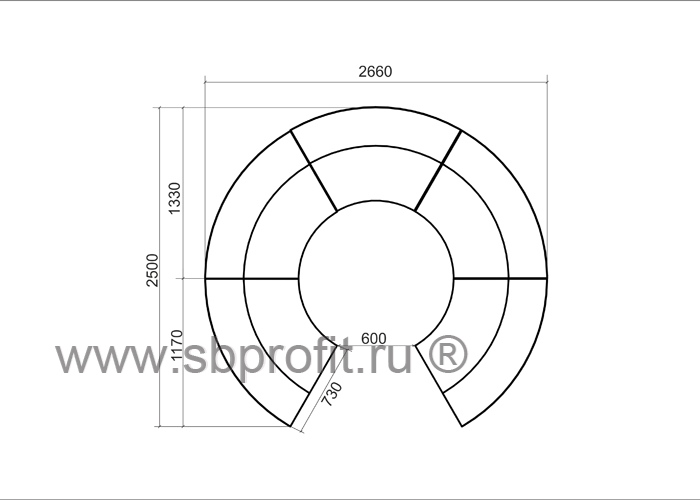 Наружний габарит композиции из пяти секторов - 2660х2500, внутренний размер (по краю столешницы)  - 1200х1000