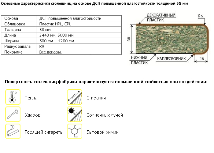 Рабочие плиты изготовлены на основе древесно-стружечной плиты, покрытой слоистым пластиком ведущих российский и европейских фирм, который производится по технологии высокого давления. Плиты изготавливаются на новейшей автоматической линии горячего прессования итальянской фирмы ITALPRESSE с вакуумной загрузкой и выгрузкой.Постформинг выполняется на оборудовании фирмы IMA (Германия). Полная автоматизация производственных процессов проведена фирмой MHF (Германия). В автоматическую производственную линию включены роботы по упаковке немецкой фирмы ITW.