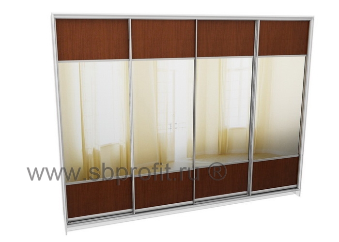 Двух ходовая система "Aristo", с нижними опорными роликами. Плавное и бесшумное движение. Верхняя и нижняя направляющие, верхние направляющие и нижние опорные ролики, ограничительные стопоры, пылезащитные щетки в комплекте. Травмобезопасные (с защитной пленкой с обратной стороны зеркальные вставки)Цвета профилей доступные для заказа - хром матовый
