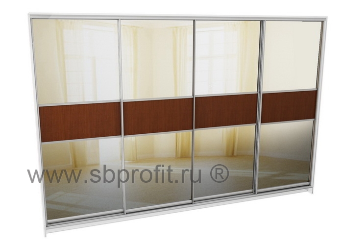 Двух ходовая система  "Aristo", с нижними опорными роликами. Плавное и бесшумное движение. Верхняя и нижняя направляющие, верхние направляющие и нижние опорные ролики, ограничительные стопоры, пылезащитные щетки в комплекте. Травмобезопасные (с защитной пленкой с обратной стороны зеркальные вставки)