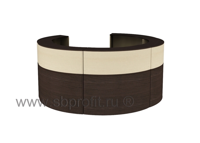 Наружний габарит композиции из пяти секторов - 2660х2500, внутренний размер (по краю столешницы) - 1200х1000Эргономиная приемная стойка выполнена из ЛДСП, толщина столешницы столов 22 мм, остальные детали изготовлены из плиты 16мм.