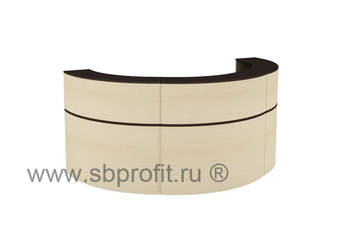 Наружний габарит композиции из трех секторов - 2660х1330, внутренний размер (по краю столешницы) - 1200х600.Эргономиная приемная стойка выполнена из ЛДСП, толщина столешницы столов 22 мм, остальные детали изготовлены из плиты 16мм.