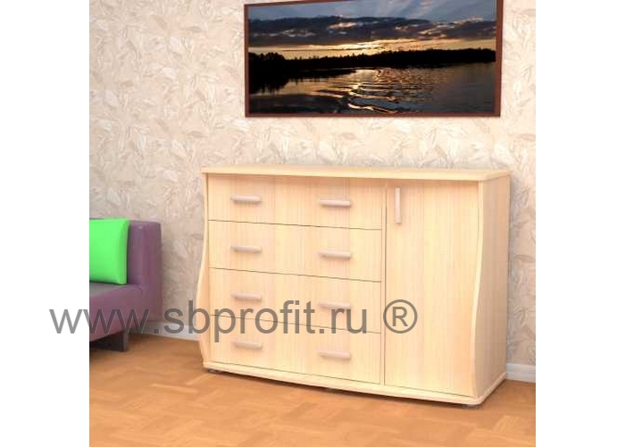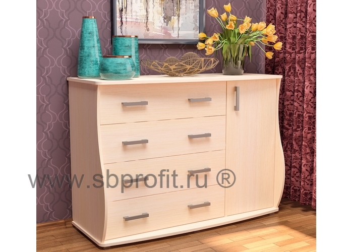 Большой, красивый и надежный комод ВЕРНИСАЖ-4 выделяется дизайном и вместительностью. Благодаря своим фигурным формам комод выглядит современно, а размеры модели (910*1280*510) позволяют поместить в комод большое количество вещей. Для этого предусмотрены 4 одинаковых выдвижных ящика, имеющих полное выдвижение. А в правой части комода - две вместительные ниши за распашной дверцей. Для удобства пользования на фасадах имеются практичные и современные ручки. Такой комод, несомненно, станет украшением любого интерьера, а разнообразие цветовой гаммы поможет выбрать комод на ваш вкус. При желании на фасады изделия можно нанести рисунок.Изделие выполнено из высококачественного и экологичного материала – ЛДСП класса Е1 толщиной 16 мм. Все края обработаны ударопрочной кромкой ПВХ, которая значительно увеличивает срок эксплуатации изделия. Для сборки используется фурнитура ведущих мировых производителей. Упакован стол в плоский гофрокартон. Внутри упаковки имеется подробная инструкция по сборке. Гарантия на изделие 24 месяца.
