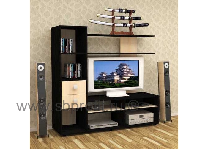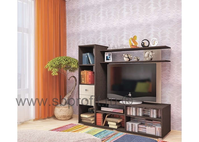 Тумба ТВ-1 – современная стильная модель гостиной. Отличительной особенностью изделия является характерная схожесть с мини-горкой. Так, правая часть тумбы оснащена пеналом с двумя выдвижными ящиками и вместительными нишами. Они удобны для размещения книг, аксессуаров и прочих принадлежностей.