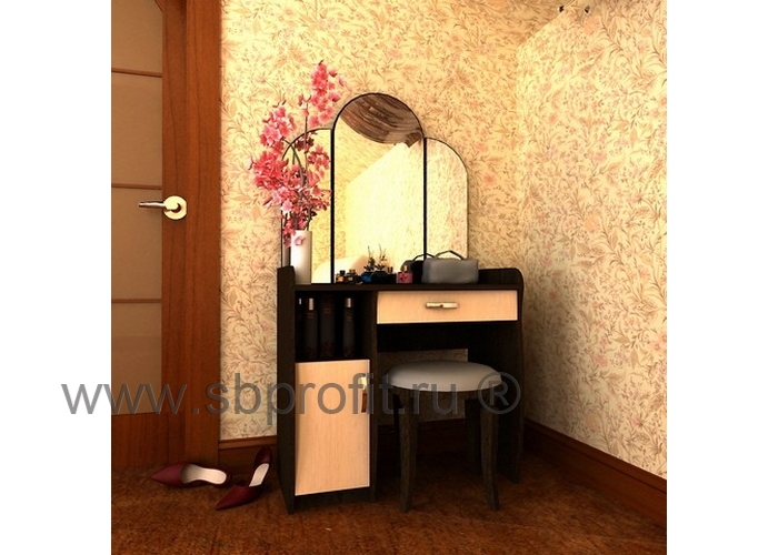 Изысканный небольшой туалетный столик Галант-1 при всей своей компактности является достаточно эргономичным и вместительным. Модель имеет три зеркала, образующих благодаря подвижной конструкции боковой и фронтальный обзор. В левой части туалетного столика находится закрытая тумба с распашной дверцей и полками внутри. Над тумбой - открытая вместительная ниша. В центральной части Галант-1 удобно расположен выдвижной ящик для косметики, мелочей и аксессуаров. Туалетный столик смотрится изящно и легко. Он станет не только любимым женским уголком, но и украсит любой интерьер.Изделие выполнено из высококачественного и экологичного материала – ЛДСП класса Е1 толщиной 16 мм. Все края обработаны ударопрочной кромкой АБС, которая значительно увеличивает срок эксплуатации изделия. Для сборки используется фурнитура ведущих мировых производителей. Упакован стол в плоский гофрокартон. Внутри упаковки имеется подробная инструкция по сборке. Гарантия на изделие 12 месяцев