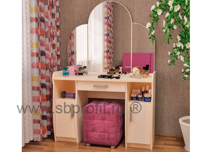 Привычные формы, элегантность, большое количество удобных полочек - все это в туалетном столике Галант-2. Конструкция модели состоит из трёх зеркал, образующих благодаря подвижной конструкции обзор со всех сторон. В центральной части находится выдвижной ящик для косметики и аксессуаров. По обеим сторонам столика - закрытые тумбы с распашными дверцами и полками. Над ними расположены вместительные полуоткрытые ниши. Туалетный столик выполнен в классическом стиле, имеет симметричные формы и прекрасно дополнит любой интерьер.Изделие выполнено из высококачественного и экологичного материала – ЛДСП класса Е1 толщиной 16 мм. Все края обработаны ударопрочной кромкой АБС, которая значительно увеличивает срок эксплуатации изделия. Для сборки используется фурнитура ведущих мировых производителей. Упакован стол в плоский гофрокартон. Внутри упаковки имеется подробная инструкция по сборке. Гарантия на изделие 12 месяцев.