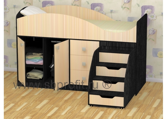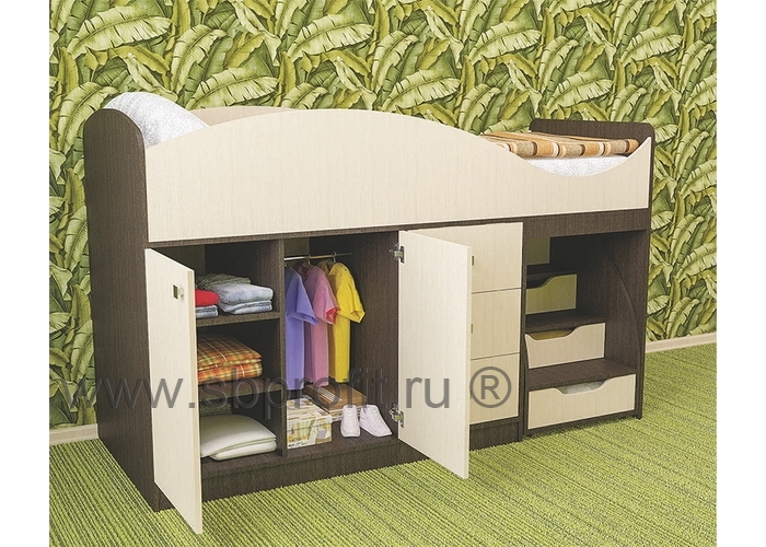 Кровать Стрелка – заветная мечта всех малышей и родителей. И это неудивительно, ведь кровать удовлетворяет главные потребности обеих сторон. Для детей она яркая, красивая, с выдвижной лесенкой и множеством мест, куда можно спрятаться или использовать в играх. А родителей прежде всего волнует безопасность, функциональность и прочность. Так, спальное место кровати размером 180х70 см. оснащено защитным бортиком, чтобы ребёнок не упал во время сна. Подняться на второй ярус ребёнок сможет по лестнице со ступеньками-ящиками. лестница легко выдвигается, а благодаря специальному механизму, не уйдёт у ребёнка из-под ног во время подъёма к кровати.Также в комплексе СТРЕЛКА предусмотрен шкаф со штангой и полками. Из-за небольшой высоты шкафа ребёнку будет удобно доставать и размещать в нём вещи. Ещё одно место для хранения – три выдвижных ящика в центральной части комплекса.