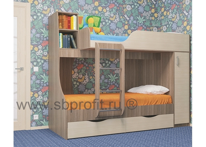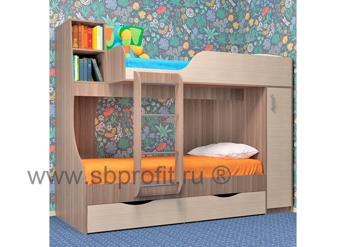 Кровать двухъярусная Башмачок имеет 2 спальных места размером 190х90 см. Спальные места кровати расположены ассиметрично и в то же время в правильной геометрической пропорции, что делает кровать современной и удобной. Также верхний ярус снабжён защитным бортиком, а снизу от падения ребёнка подстрахует широкая лестница. Также в правой части кровать содержит шкаф со штангой и полками, внизу - два удобных выдвижных ящика. Здесь поместятся постельные принадлежности и игрушки. Функциональным дополнением и украшением кровати служат открытие ниши для книг в левой части конструкции. Спальное место имеет размер 90х190 см. Спальное место второго яруса снабжено защитным бортиком.Изготовлена кровать из качественного ламинированного ДСП толщиной 16 мм класса Е1 - самого популярного материала для производства корпусной мебели, обеспечивающего необходимую прочность и долговечность деталей. Все края обработаны ударопрочной кромкой ПВХ, которая значительно увеличивает срок эксплуатации изделия. Для сборки используется фурнитура ведущих мировых производителей.