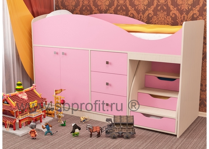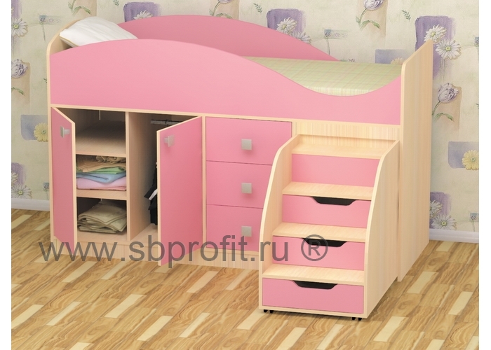 Кровать Стрелка – заветная мечта всех малышей и родителей. И это неудивительно, ведь кровать удовлетворяет главные потребности обеих сторон. Для детей она яркая, красивая, с выдвижной лесенкой и множеством мест, куда можно спрятаться или использовать в играх. А родителей прежде всего волнует безопасность, функциональность и прочность. Так, спальное место кровати размером 180х70 см. оснащено защитным бортиком, чтобы ребёнок не упал во время сна. Подняться на второй ярус ребёнок сможет по лестнице со ступеньками-ящиками. лестница легко выдвигается, а благодаря специальному механизму, не уйдёт у ребёнка из-под ног во время подъёма к кровати.Также в комплексе СТРЕЛКА предусмотрен шкаф со штангой и полками. Из-за небольшой высоты шкафа ребёнку будет удобно доставать и размещать в нём вещи. Ещё одно место для хранения – три выдвижных ящика в центральной части комплекса.