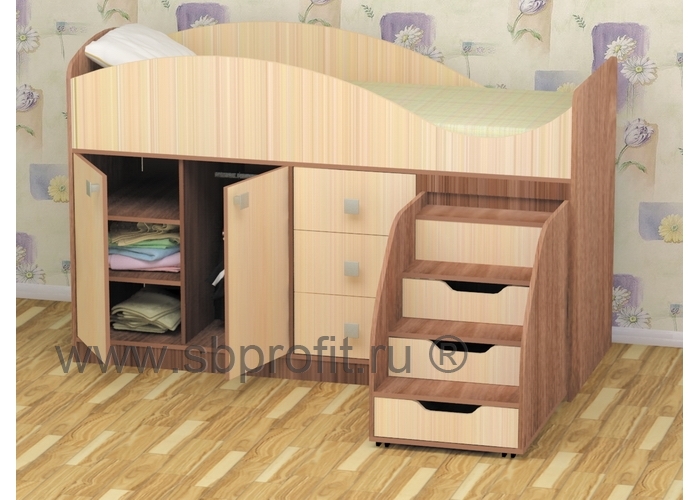 Кровать Стрелка – заветная мечта всех малышей и родителей. И это неудивительно, ведь кровать удовлетворяет главные потребности обеих сторон. Для детей она яркая, красивая, с выдвижной лесенкой и множеством мест, куда можно спрятаться или использовать в играх. А родителей прежде всего волнует безопасность, функциональность и прочность. Так, спальное место кровати размером 180х70 см. оснащено защитным бортиком, чтобы ребёнок не упал во время сна. Подняться на второй ярус ребёнок сможет по лестнице со ступеньками-ящиками. лестница легко выдвигается, а благодаря специальному механизму, не уйдёт у ребёнка из-под ног во время подъёма к кровати.Также в комплексе СТРЕЛКА предусмотрен шкаф со штангой и полками. Из-за небольшой высоты шкафа ребёнку будет удобно доставать и размещать в нём вещи. Ещё одно место для хранения – три выдвижных ящика в центральной части комплекса.