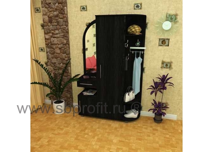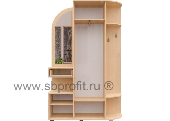 Левая часть прихожей снабжена зеркалом. Под ним имеется выдвижной ящик, образующий дополнительную полку, открытая ниша для газет и журналов, а также закрытая тумба с распашной дверцей, внутри которой две дополнительные ниши.