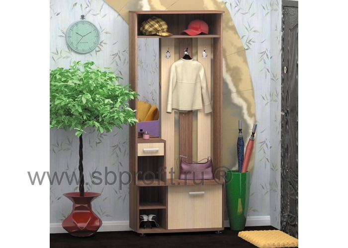 Отличный вариант для малогабаритных квартир – прихожая ПР-10. Меньше метра в длину, она впишется в любой интерьер и станет незаменимым домашним помощником. Несмотря на небольшие размеры, модель может вместить в себя немало одежды, обуви и головных уборов. Для этого в правой части ПР-10 есть открытая вешалка с крючками. Под ней – ящик для обуви с откидной дверцей, который также служит полкой для сумок, портфелей, зонтов. Кроме того, в верхней части прихожей оборудована полка для головных уборов и шарфов. Ну и какая же прихожая без ши для обуви. Прихожая ПР-10 миниатюрна и эргономична, в ней нет ничего лишнего.Изделие выполнено из высококачественного и экологичного материала – ЛДСП класса Е1 толщиной 16 мм. Края изделия обработаны ударопрочной кромкой нового поколения АБС, которая значительно увеличивает срок эксплуатации изделия. Для сборки изделия используется фурнитура ведущих мировых производителей.