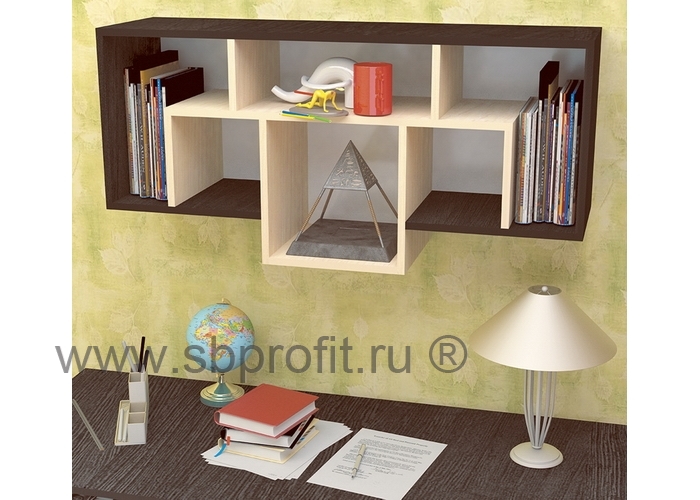 Полка навесная ПН-2 станет отличным дополнением к интерьеру гостиной, детской и даже офиса. Здесь поместятся и книги, и аксессуары. Полка имеет форму многоугольника, в котором изящно сконструированы перегородки, образующие собой интересную фигуру с шестью открытыми нишами разной высоты и ширины. Сверху полка имеет дополнительную рабочую поверхность, куда можно поставить акустическую систему или украсить цветами.Изделие выполнено из высококачественного и экологичного материала – ЛДСП класса Е1 толщиной 16 мм. Все края обработаны ударопрочной кромкой нового поколения АБС, которая значительно увеличивает срок эксплуатации изделия. Для сборки используется фурнитура ведущих мировых производителей.