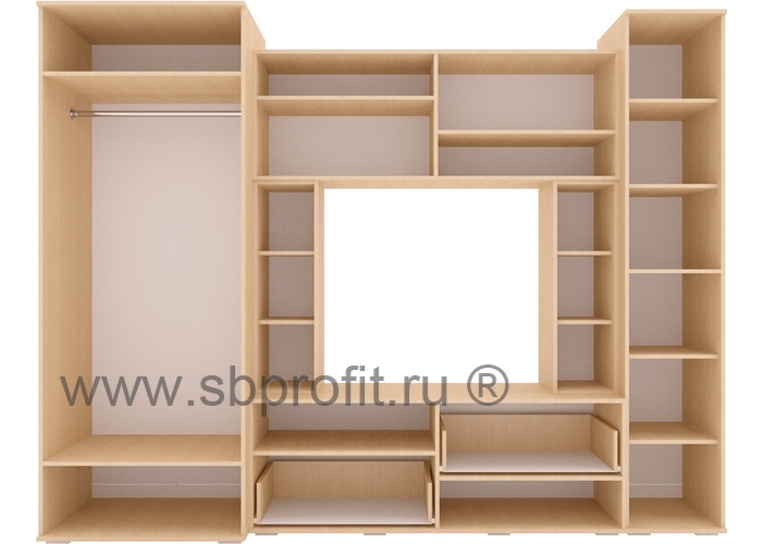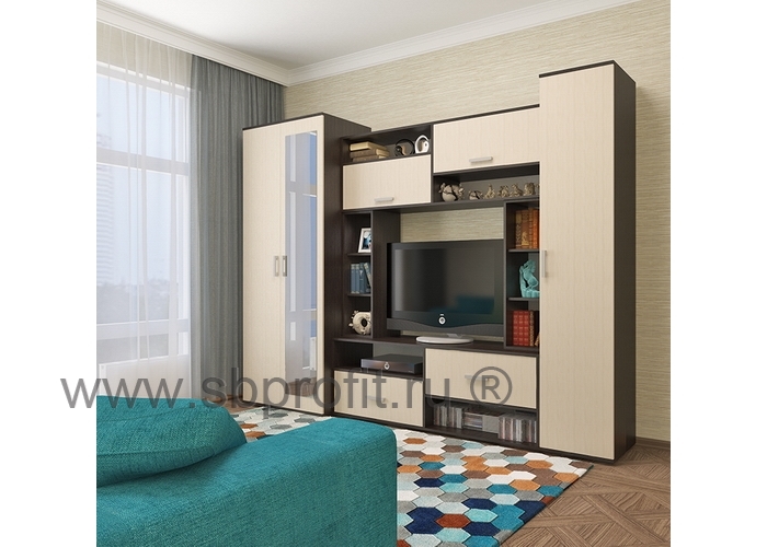 Гостиная ГАММА - отличное решение для тех, кто любит функциональность и простой дизайн. В классическом ансамбле сочетается вместительность, удобство и стиль. Здесь же просторный шкаф со штангой и полками, отдельный закрытый блок с полками, а также небольшие ящики в верхней и нижней частях комплекса. Ниша под телевизор размером 880*970 мм. Несмотря на обилие мест для хранения, гостиная не перегружает помещение. Эффект лёгкости придают открытые полки и зеркало на одной из створок шкафа. А простая, надёжная фурнитура под металл создаёт современный облик гостиной. Ансамбль может быть выполнен в цвете дуб сонома, а также в сочетании дуб венге и молочный дуб или ясень шимо тёмный и светлый. Именно такая цветовая палитра придаёт контраст гостиной и делает её универсальной.Изделие выполнено из высококачественного и экологичного материала – ЛДСП класса Е1 толщиной 16 мм. Края обработаны ударопрочной кромкой нового поколения АБС, которая значительно увеличивает срок эксплуатации изделия. Для сборки используется фурнитура ведущих мировых производителей. Упаковано изделие в плоский гофрокартон, оклеенный скотчем с логотипом фабрики. На упаковке имеется ярлык, содержащий следующие сведения: наименование изделия, цвет, дата упаковки, кодовый номер упаковщика. Внутри упаковки имеется пакет с необходимой фурнитурой и подробная инструкция по сборке. Гарантия 12 месяцев