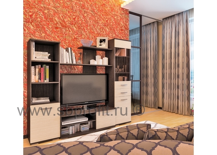 Несмотря на новизну модели гостиная «Фиеста» уже полюбилась покупателю. Невесомая и практичная, стильная, мобильная и малогабаритная – именно эти качества помогли ей стать хитом продаж. В первую очередь «Фиесту» оценили обладатели небольших квартир, ведь гостиная в длину меньше 2-х метров, но при этом она вместительна и функциональна. Здесь и шкафы с распашными дверцами, и выдвижные ящики, и открытые полки. В них поместится всё необходимое от техники до книг и аксессуаров. Именно открытые полки, а также стеклянные вставки на дверцах делают всю конструкцию почти воздушной. Гостиная практически встраиваются в стену, не сужая при этом помещение. Дизайн также продуман до мелочей и порадует даже самого искушённого покупателя. место под телевизор 800х1000 мм.Изделие выполнено из высококачественного и экологичного материала – ЛДСП класса Е1 толщиной 16 мм. Края обработаны ударопрочной кромкой нового поколения АБС, которая значительно увеличивает срок эксплуатации изделия. Для сборки используется фурнитура ведущих мировых производителей