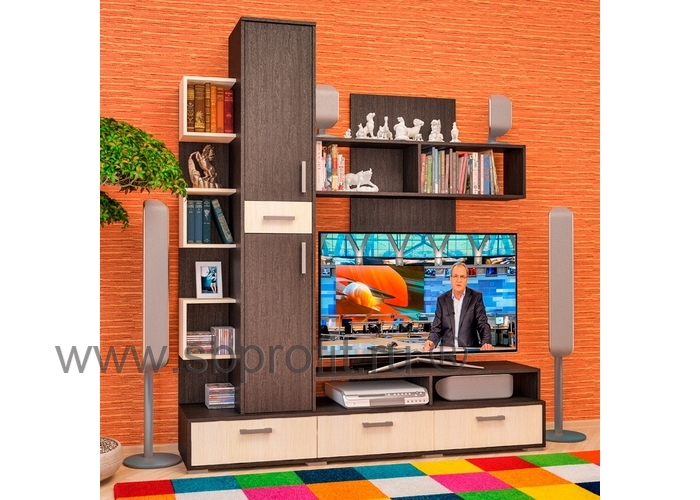 Гостиная МОДЕРН отвечает всем требованиям современности. Лёгкая, функциональная, незаурядная. Несмотря на обилие деталей, гостиная выглядит просто, но с изюминкой. Такой эффект создаётся за счёт множества открытых полок, созданных в виде геометрических фигур. Также гостиная изобилует выдвижными ящиками в нижней части, что делает конструкцию устойчивой и вместительной. Помимо этого, под местом для телевизора размером 880х1190 мм. расположены открытые ниши, куда отлично впишется техника. Ну а «держится» весь ансамбль на небольшом шкафчике с распашными дверцами. Поэтому гостиная «Модерн» послужит не просто украшением комнаты, но и полноценным местом для хранения.Изделие выполнено из высококачественного и экологичного материала – ЛДСП класса Е1 толщиной 16 мм. Края обработаны ударопрочной кромкой нового поколения АБС, которая значительно увеличивает срок эксплуатации изделия. Для сборки используется фурнитура ведущих мировых производителей