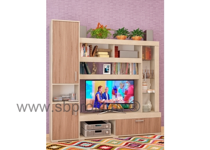 Гостиная «Сити» - база модульного комплекта. Её можно дополнить различными элементами, которые будут уместны как в гостиной, так и в спальне, детской и даже прихожей. Таким образом, вы создаёте уникальный ансамбль, исходя из своих потребностей. Стенка Сити представляет собой синтез классики и современных веяний дизайна. Чёткость линий и функциональность – главные характеристики модели. Центр композиции составляет ниша под телевизор размером 570х1086 мм., ниже – открытая полка для игровой приставки или прочих предметов. Рядом с ней широкий шкаф с откидной дверцей. Большой плюс гостиной Сити – вместительность. Этой задаче служит шкаф с распашными дверцами в левой части модели. На две части его делит открытая ниша. Также гостиная богата полками различной длины. При чём выглядят они необычно, благодаря широким декоративным фасадам. Украшением Сити служит небольшой шкаф с полками за стеклянной дверцей. Эта деталь придаёт модели уникальность, воздушность и утончённость.