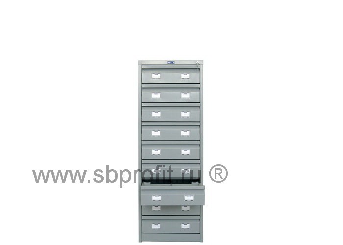 Поставляется в разобранном виде. Картотека девятисекционная под карточки формата A6 цельносварная. Центральный замок. Телескопические направляющие. Выдвижные ящики. Каждый ящик разделен перегородкой на две части. Каждый ящик укомплектован двумя пластинами для регулировки наполнения. Толщина металла 0,8 мм. Покрытие полимерное - светло серое.